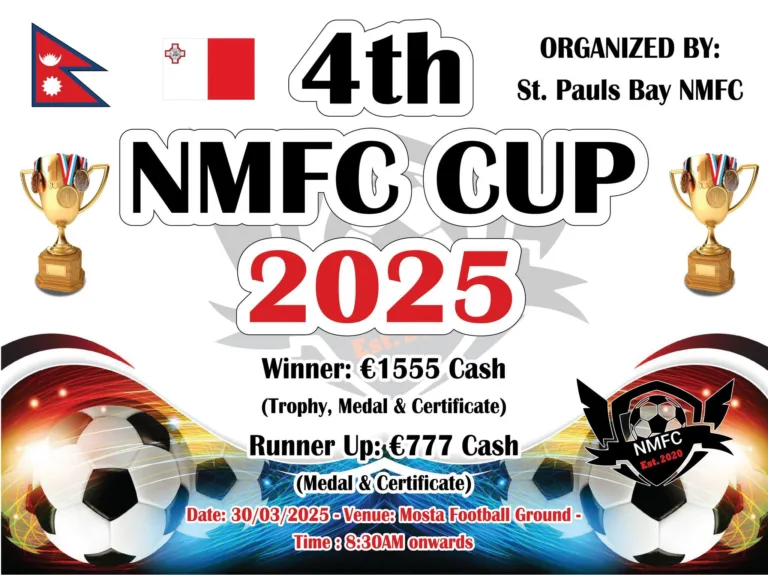 माल्टा नेपाल अनलाइन / युरोपको माल्टामा नेपालीहरुको फुटबल क्लबमा अब्बल रहेको नेपाल माल्टा फुटबल क्लब (एनएमएफसी)ले नयाँ वर्ष २०८२ को अवसर पारेर चौथो सेभेन ए साइड फुटबल प्रतियोगिता गर्ने भएको