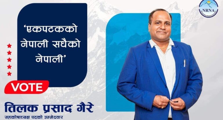गैरआवासीय नेपाली संघ (एनआरएनए) को सहकोषाध्क्षका उम्मेदवार तिलक प्रसाद गैरेले वैदेशिक रोजगारीमा रहेका नेपालीलाई सामाजिक सुरक्षा कोषको दायरामा ल्याउनुपर्ने बताएका छन् । चुनावी अन्र्तक्रिया गर्दै विभिन्न देश पुगेर उनले विदेशमा