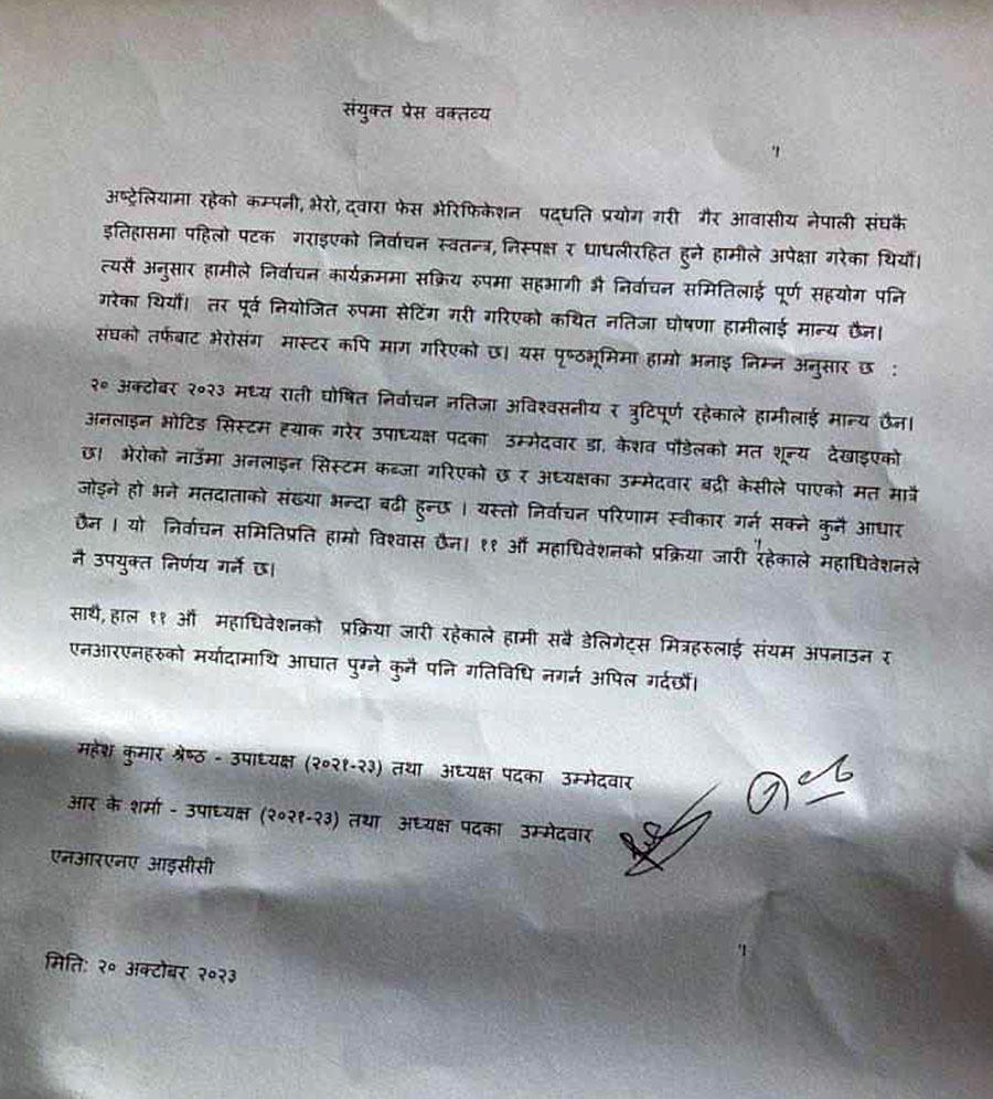 ‘अनलाइन भोटिङ सिस्टम ह्याक गरेर उपाध्यक्ष पदका उम्मेदवार केशव पौडेलको मत शून्य देखाइएको छ । भेरो कम्पनीको नाममा अनलाइन सिस्टम कब्जा गरिएको छ,’ विज्ञप्तिमा भनिएको छ, ‘अध्यक्षका उम्मेदवार बद्री केसीले पाएको मत मात्रै जोड्ने हो भने मतदाताको संख्या भन्दा बढी हुन्छ, यस्तो निर्वाचन परिणाम स्वीकार गर्न सक्ने कुनै आधार छैन ।’ निर्वाचन समितिप्रति विश्वास नभएको बताएका छन् । अध्यक्षका दुई उम्मेदवारले जारी गरेको विज्ञप्तिमा भनिएको छ, ‘११औं महाधिवेशनको प्रक्रिया जारी रहेकाले महाधिवेशनले उपयुक्त निर्णय गर्ने छ,’ विज्ञप्तिमा भनिएको छ, ‘हामी सबै डेलिगेट्स मित्रहरुलाई संयम अपनाउन र एनआरएनहरुको मर्यादामाथि आघात पुग्ने कुनै पनि गतिविधि नगर्न अपिल गर्दछौं ।’