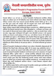यसै परिवेशमा नेपालमा पनि नेपालीहरु आफ्नो देश छाडी विदेशिने क्रम बढ्दो छ र विदेशिएका हामी नेपालीको रेमिट्यान्सले देशको आर्थिक पक्षमा ठूलो सहयोग पुगेको सरकारले बिर्सनु हुँदैन । नेपालमा लगानी गर्ने वातावरण निर्माण गर्नुपर्ने परिवेशमा उल्टो नेपाल सरकारले हालसालै अघि सारेको यो भिषा बारेको अध्यादेशको (ड्राफ्ट) गैर आवासीय नेपालीहरूको संवैधानिक हक अधिकार विपरीत र नेपालको संविधानको पूर्ण उल्लंघन कार्य भएकोले अध्याधेश तत्काल फिर्ता लनुपर्छ भन्दै सरकारको कामप्रर्ती नेपाली जनप्रगततिशील मञ्च युरोपले विरोध जनाएको छ ।