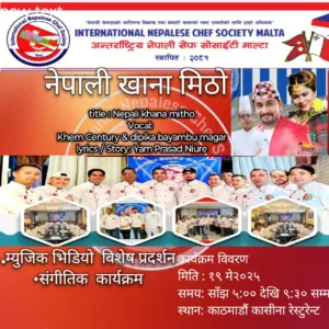 धनराज वि.क. (अविरल) माल्टा (युरोप) / नेपाली खाना सम्बन्धी बनेको पहिलो नेपाली खाना मिठो बोलको गीत युरोपको माल्टामा रिरिज हुने भएको छ । अन्तराष्ट्रिय सेफ सोसाइटी माल्टाले निमार्ण गरेको नेपाली खाना मिठो गीतको भिडियो जेष्ठ ५ गते मे १९ तारीखका दिन माल्टामा रिलिज हुन लागेको अन्तराष्ट्रिय सेफ सोसाइटी माल्टाका अध्यक्ष बासुदेव भुसालले बताए ।