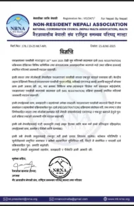 विज्ञप्तिमा भनिएको छ, ‘हामी तपाईंहरूको साथ, समझदारी र सहयोगको अपेक्षा राख्दछौं। एनआरएनए एनसीसी माल्टाले छिट्टै नै एक समाधान र सहकार्यको प्रक्रियामार्फत पुनः दर्ता प्रक्रियामा संशोधन गरी, एक स्पष्ट र ठोस निर्णयसहित माल्टा तथा गोजोमा बसोबास गर्ने नेपाली डायस्पोरालाई एकताबद्ध र एकजुट बनाउने हेतुले पुनः दर्ता प्रक्रिया ल्याउने जानकारी दिइएको छ ।