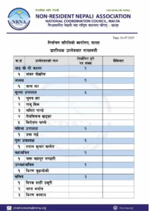 राष्ट्रिय समन्वय परिषद् (एनआरएनए) माल्टाको २०२५–२७ कार्यकालका लागि निर्धारित निर्वाचन प्रक्रिया अनुसार उम्मेदवारी मनोनयन दर्ता सम्पन्न भएको छ । निर्वाचन समितिले सार्वजनिक गरेको प्रारम्भिक नामावली अनुसार कोषाध्यक्ष पदमा मात्र दिपेन्द्र कार्की र उदयबाबु श्रेष्ठबीच प्रतिस्पर्धा हुने भएको छ। अन्य सबै पदहरूमा भने एकल उम्मेदवारी परेकाले निर्विरोध निर्वाचित हुने सम्भावना प्रबल छ ।