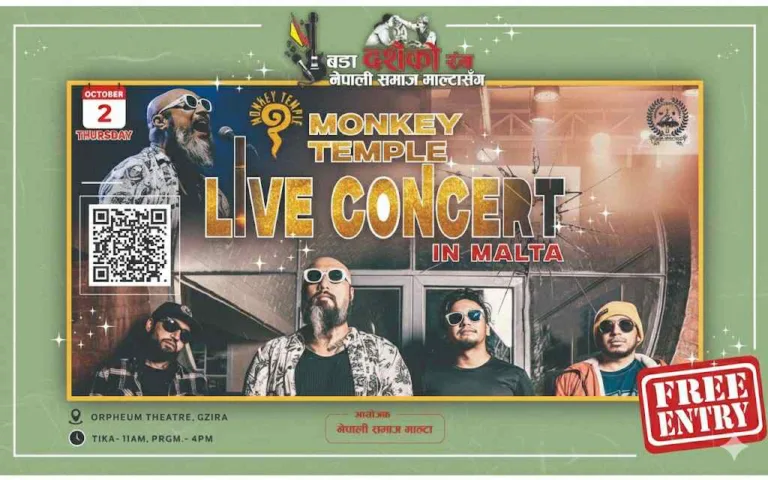 माल्टा नेपाल अनलाइन डेस्क / माल्टामा बसोबास गर्ने नेपालीहरूका लागि नेपथ्यको भब्य कन्सर्ट आयोजना हुने भएको छ । नेपाली संगीत ब्यान्ड नेपथ्यलाई आगामी २७ अगस्ट २०२५ मा माल्टामा भब्य कन्सर्टका लागि ल्याउन लागेको एनएमएफसीले करिब ४ हजार दर्शकले कन्सर्ट हेर्ने अनुमान गरेको छ । नेपथ्यको कन्सर्ट माल्टा फेयर एण्ड कन्वेन्सन्स सेन्टर( एमएफसीसीमा) हुने भएको छ । माल्टाको सबैभन्दा ठूलो हल जहाँ बहुउद्देश्यीय सम्मेलन र प्रदर्शनी स्थलको रुपमा रहेको छ । कन्सर्ट आयोजना हुने स्थल माल्टाको ताआली, अत्तार्डमा रहेको छ ।